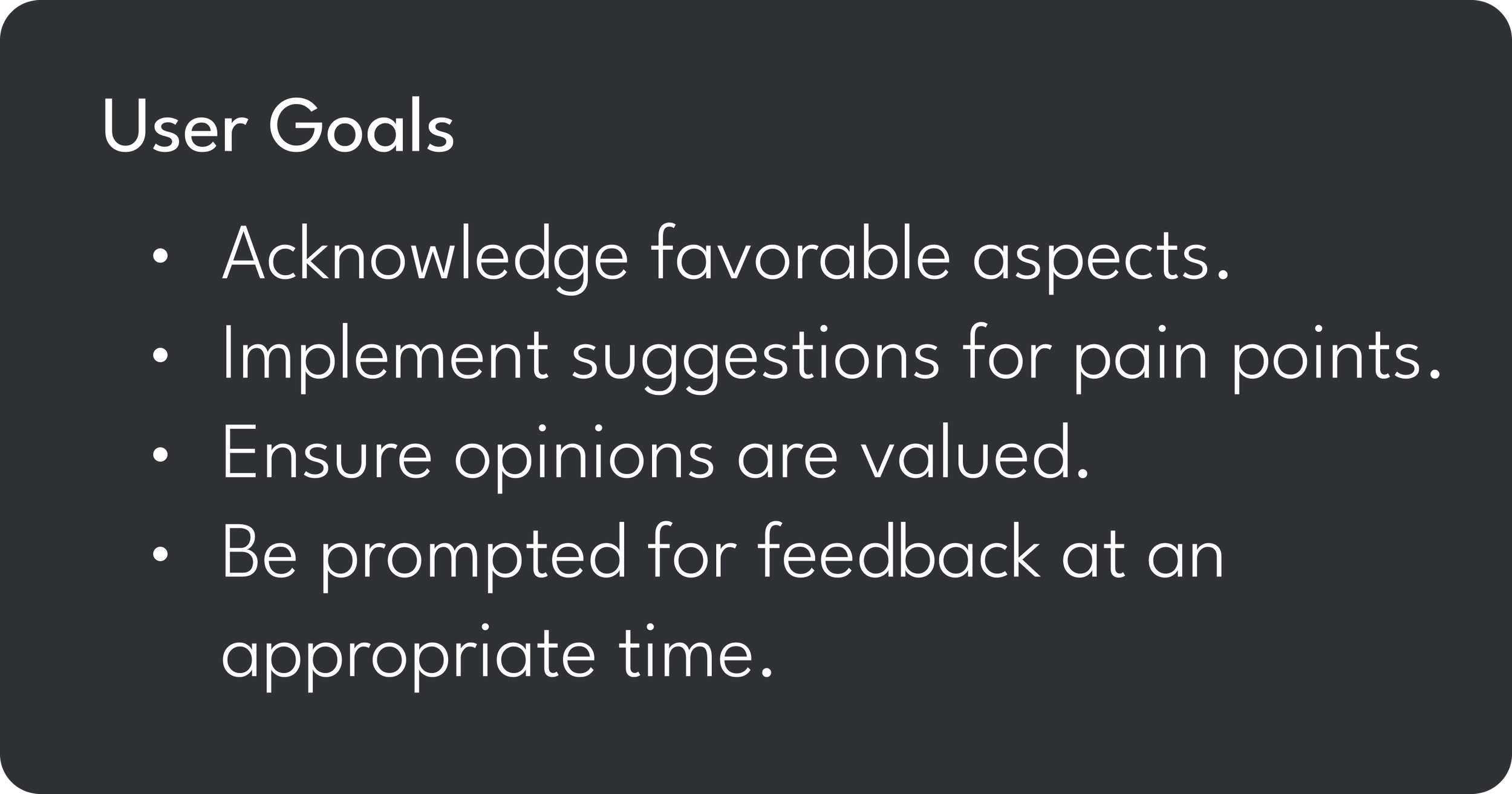 I began with a competitor analysis of feedback flows and scoured academic journals in order to ideate a feedback flow prioritizing usability and enhanced customer experience.